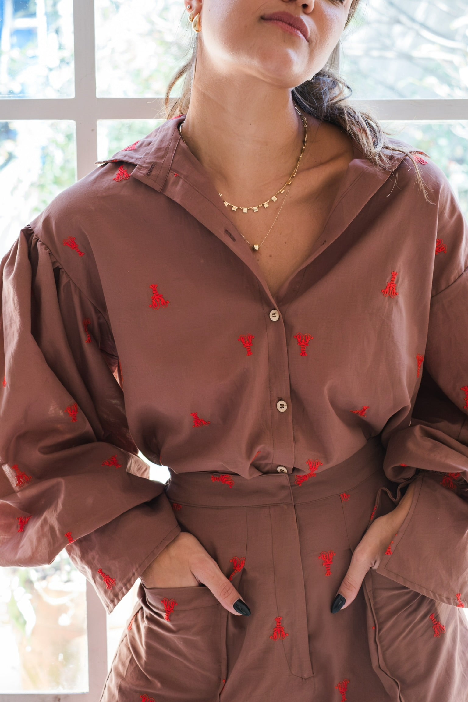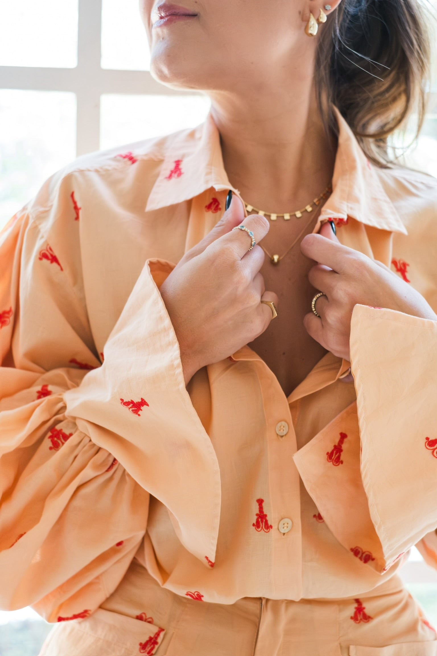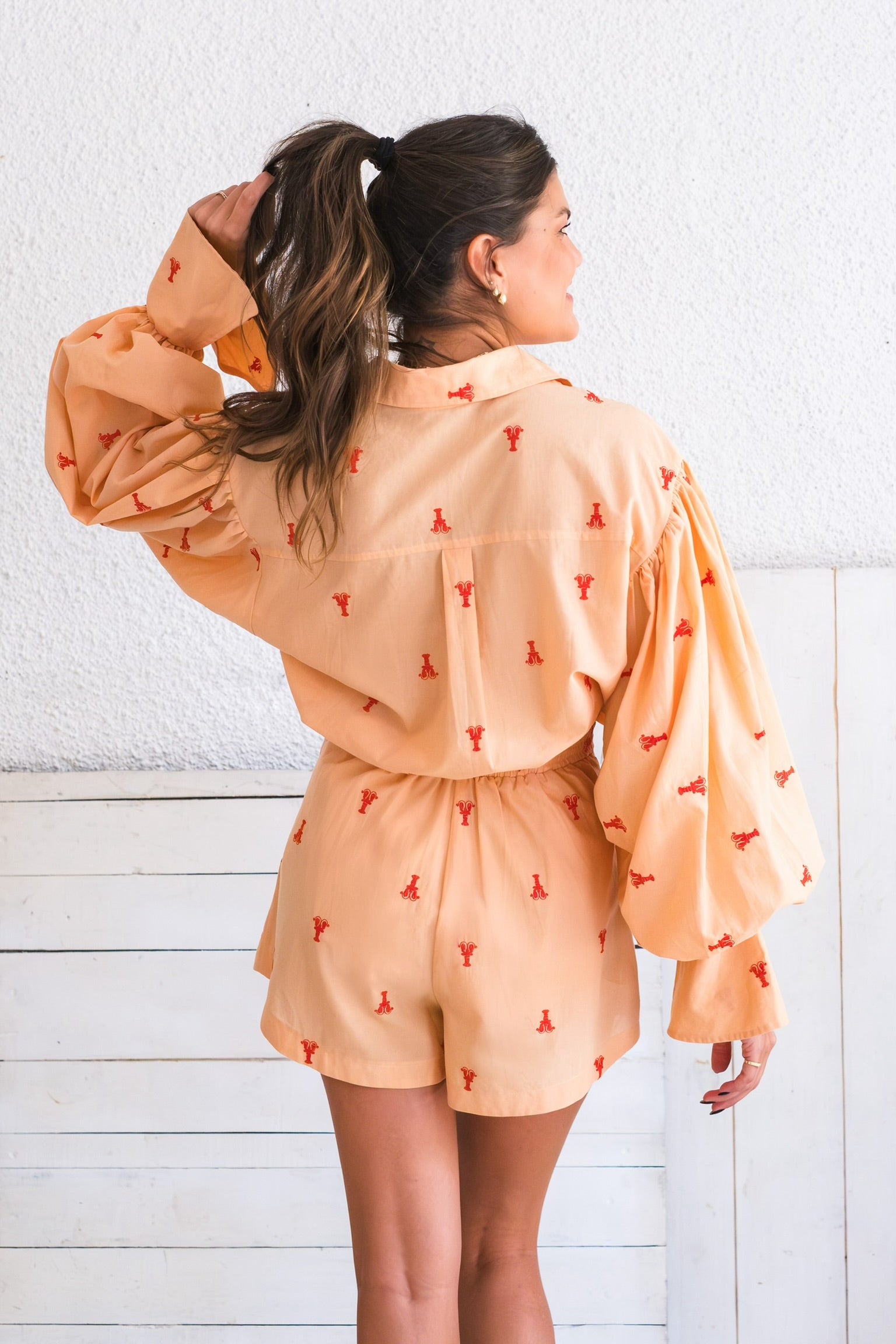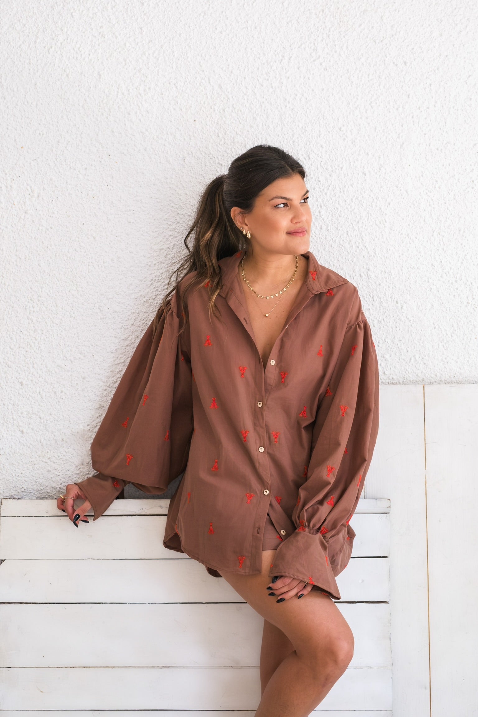 Mantendo o frescor e a leveza do 100% algodão, essa edição especial traz mangas bufantes, adicionando um toque de romantismo e sofisticação à peça. O bordado delicado de lagostas continua sendo o grande destaque, trazendo charme e originalidade para o seu look.