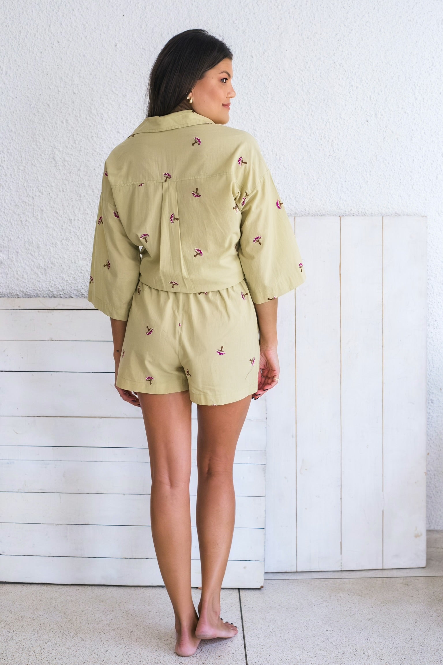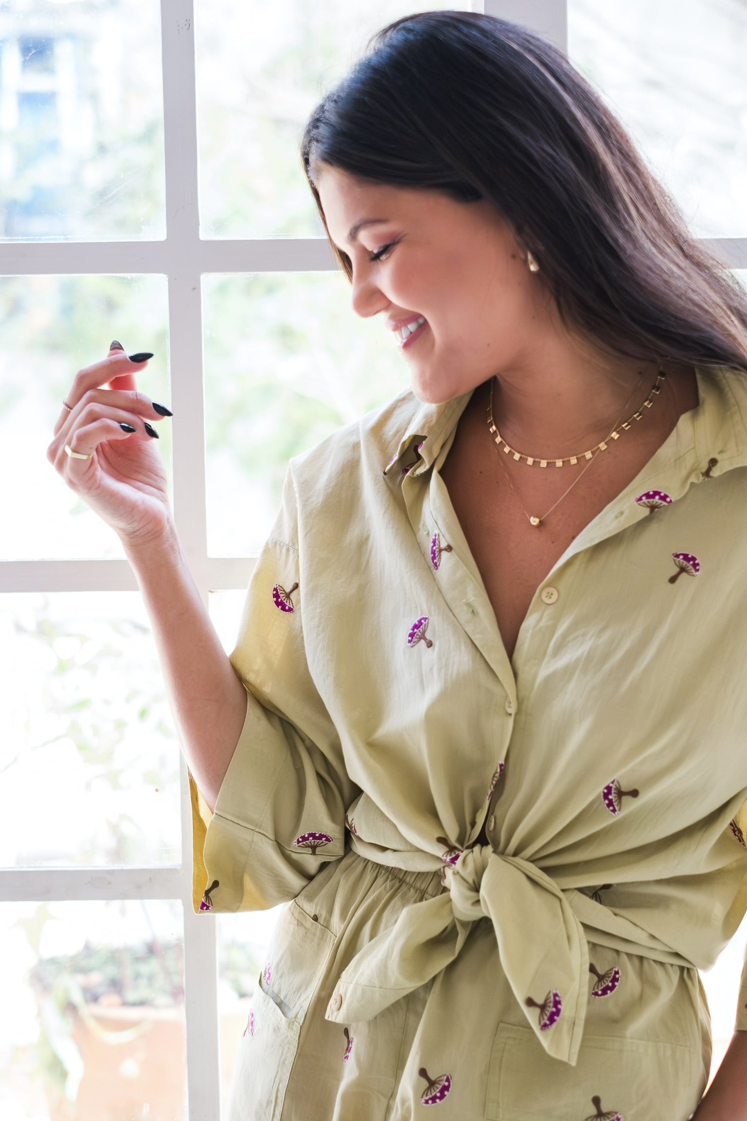A nova versão, ganhou mangas curtas e um corte levemente evasê, além de uma combinação linda: o shorts cogumelos. Desenvolvida em 100% algodão, ela combina conforto e estilo com o toque especial dos cogumelos bordados em linha.