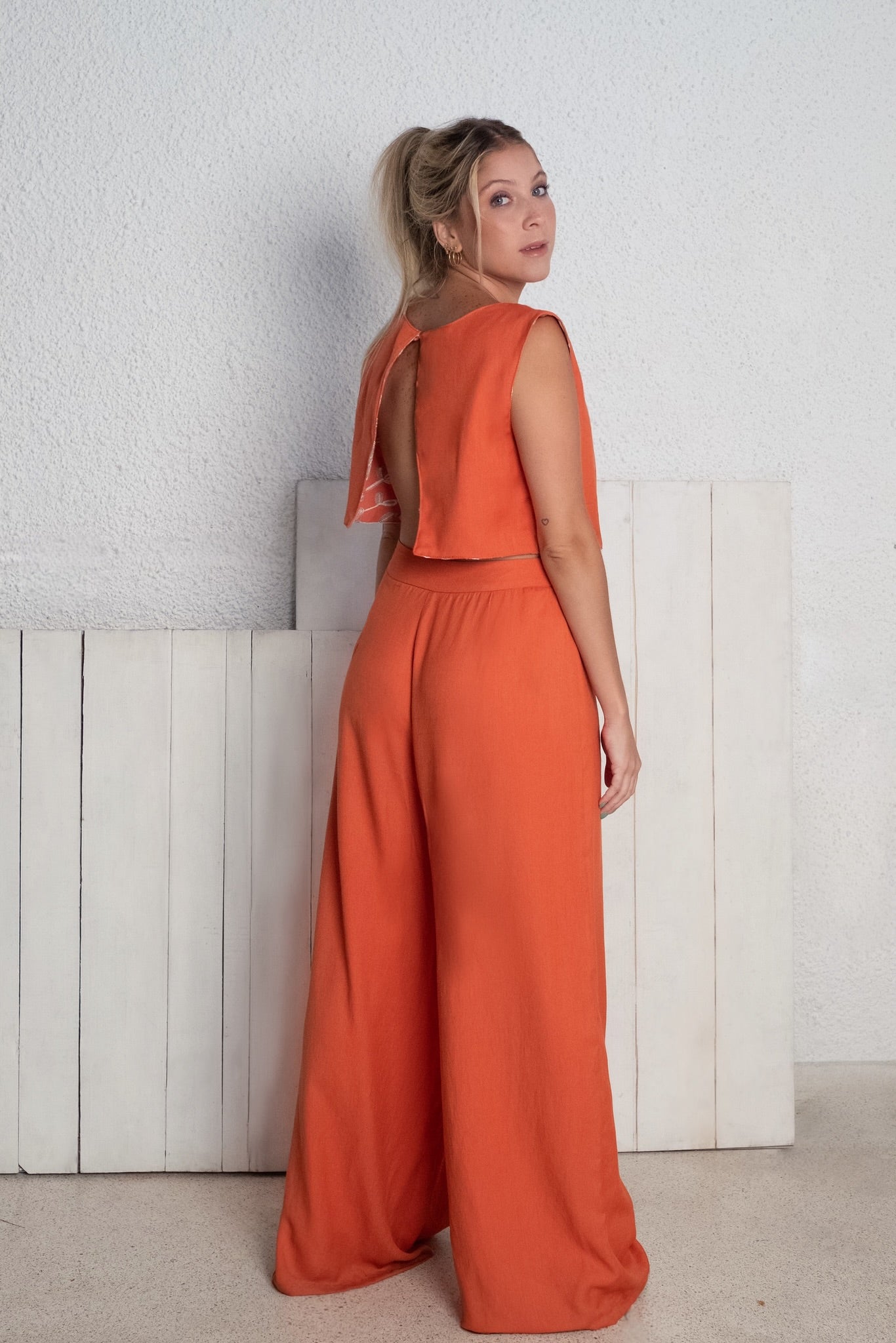 Cropped dupla face! Uma peça especial por seu design diferenciado e também por sua versatilidade, uma vez que pode ser usado frente e verso. Desenvolvido em linho bordado, com desenho exclusivo de um lado, e do outro um lindo laranja para composições mais neutras.
